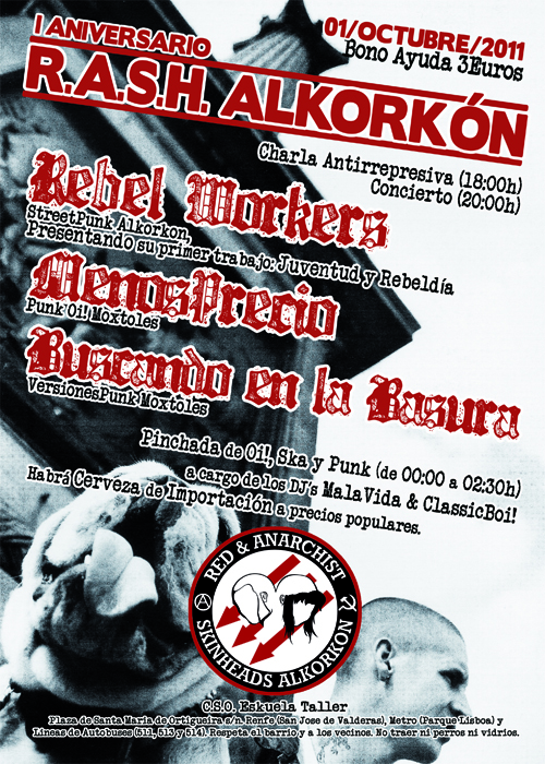 20:00h (puntualidad) Concierto: Rebel Workers (Streetpunk Alkorkón) Presentando su primer trabajo Juventud y Rebeldia + MenosPrecio (Punk Oi! Moxtoles) + Buscando en la basura( Versiones Punk Moxtoles)